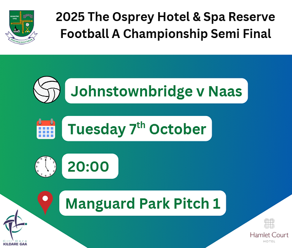 Best of luck to the Johnstownbridge Bs who take on Naas tomorrow in the Semi Final of the 2025 Osprey Hotel & Spa Reserve Football A Championship.