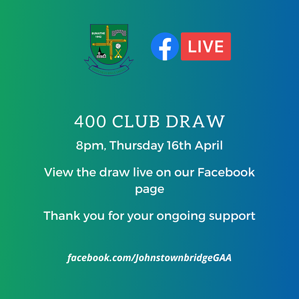 Our 400 Club Draw takes place this Thursday, April 16th at 8pm live from the Breda Centre, Johnstownbridge.
